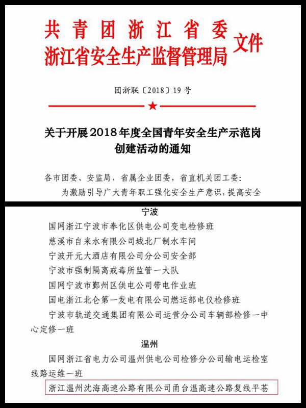近日,共青团浙江省委、省安监局联合发布《关于开展2018年度全国青年安全生产示范岗创建活动的通知》,沈海公司平苍处脱颖而出,成为全温州5个名额中的其中一家。
