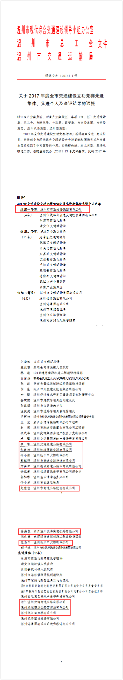 2017年度全市交通建设立功竞赛先进集体、先进个人及考评结果(组织一等奖:交投集团;先进个人:李革、包道桧、邵小燕、郭鹏程、方高伟、赵佳佳、徐嘉良、张湉田;先进集体:沈海公司、绕西南公司、瓯江口公司)