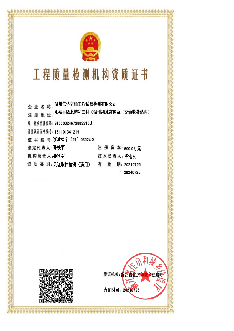 7月26日,经浙江省住房和城乡建设厅审批,信达检测公司获得建设工程见证取样检测(通用)资质,这是信达公司在建设工程领域取得的首个资质。