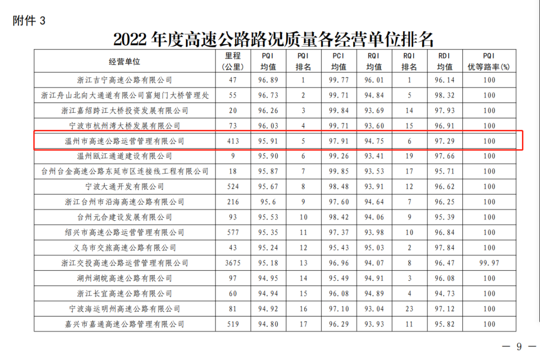 近日,浙江省公路与运输管理中心公布了2022年全省全省高速公路路况检测结果,运营公司管辖247公里高速公路,路面技术状况指数(PQI)均值95.91,在全省29家运营单位中排名第五,全市排名第一。其中,管辖的甬莞高速(温州段)路面技术状况指数(PQI)均值96.25,排名全省第三。