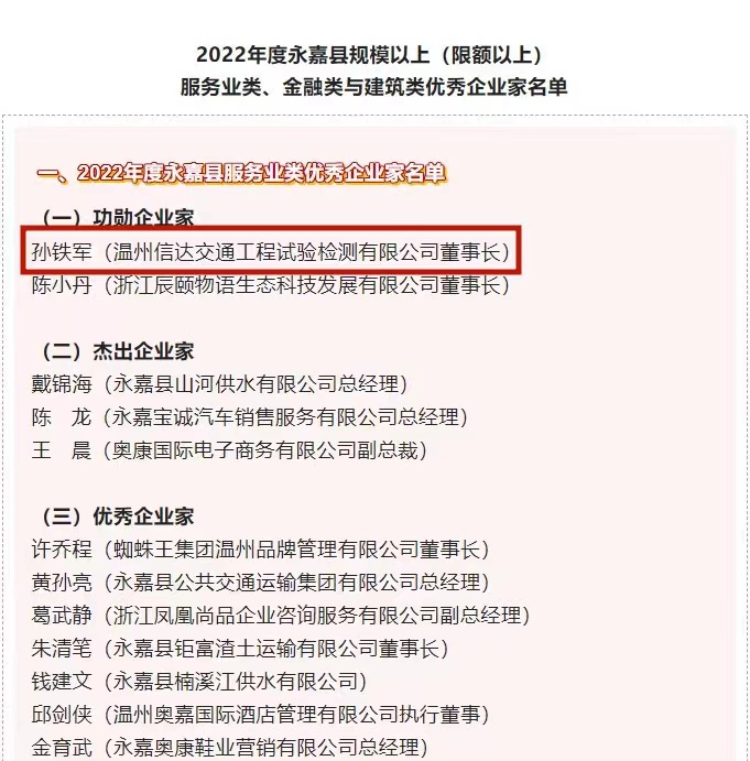 日前,永嘉县政府公布2022年度永嘉县规模以上(限额以上)服务业类优秀企业名单,诚达公司下属信达检测公司获评“永嘉县2022年度功勋企业”称号。2018至2020年,公司已连续三年荣获永嘉县明星企业称号。继2021年获评“永嘉县巨龙企业”称号后,今年首获“永嘉县功勋企业”称号。