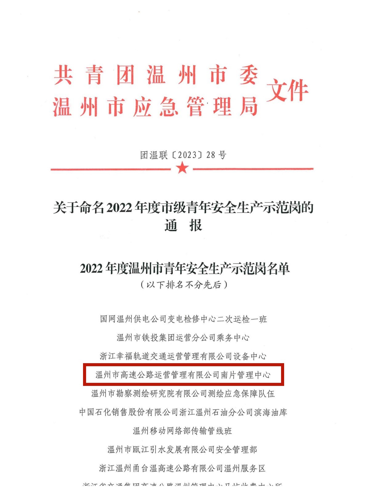 近日,运营公司南片管理中心喜获“2022年度温州市青年安全生产示范岗”称号,公司再添市级“青”字号荣誉。