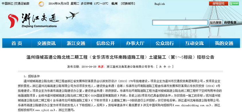 4月28日,温州绕城高速公路北线二期项目发布土建施工招标公告,并于4月29日开始发售施工招标文件,这两项工作的启动预示着本项目已正式进入招投标工作流程,这为年内项目开工、投资落地奠定了扎实的基础条件。