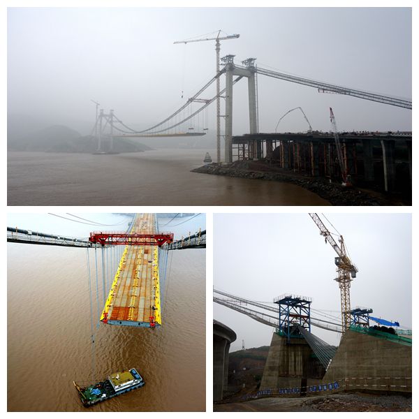 现场考察过程中,为更加清楚直观地了解官山大桥的工程细节和建设者的工作情况,考察小组认真查看了大桥的锚定和桥墩结构,沿着大桥建设猫道攀爬到90多米高的桥梁主塔顶部体会工程建设艰苦环境,并实时听取施工单位人员现场介绍,仔细拍摄大桥关键部位照片,便于日后深入研究。现场考察结束后,考察小组来到施工单位会议室,观看了生动完整的官山大桥施工视频短片,并就工程施工专业问题与官山大桥指挥部、施工单位的领导进行了深入交流。
