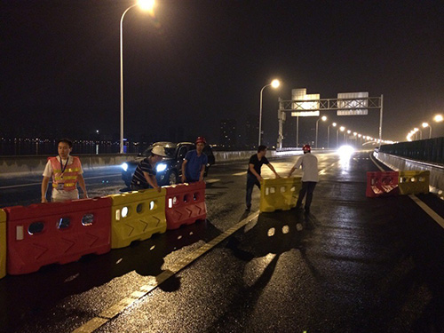 6月29日晚10点,现场清理基本已结束。质量、安全均受可控状态。但为杜绝试通车之日市民无任何安全忧患,李总再次带领全体人员步行于南北两岸之间。冒雨亲自打扫桥面、亲自搬运建材、亲自安放警示标志牌等。