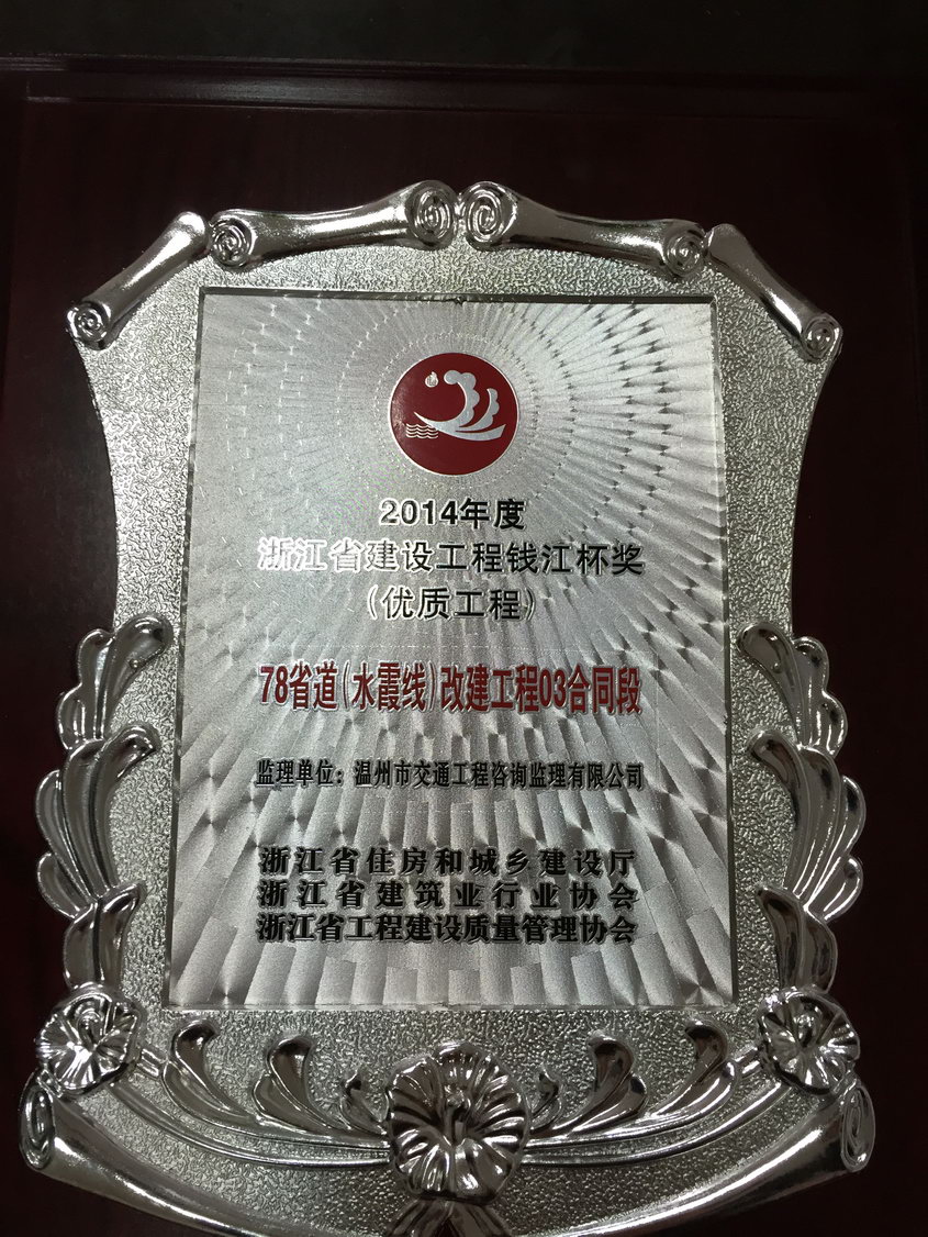 根据《关于公布2014年度浙江省建设工程钱江杯奖(优质工程)评选结果的通知》(浙建建〔2014〕55号),监理公司所监工程78省道(水霞线)改建工程03合同段被评为2014年度浙江省建设工程钱江杯奖(优质工程)。
