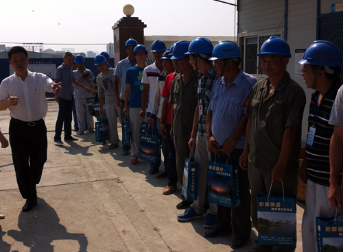 8月4日,乐清市总工会开展以“夏季清凉保安全”为主题的“三送”安全进企业高温慰问活动。乐清市政协副主席、总工会主席谷燎,乐清市总工会副主席徐乐荣,乐清市发改局重点办主任林立扬等来到甬台温复线南塘至黄华段4标施工现场,慰问在炎炎烈日下坚守一线的工人们,并亲自将牙膏、洗发水、沐浴露、香皂、毛巾、矿泉水、公共安全知识手册、防暑降温药品等物品送入工人手中。