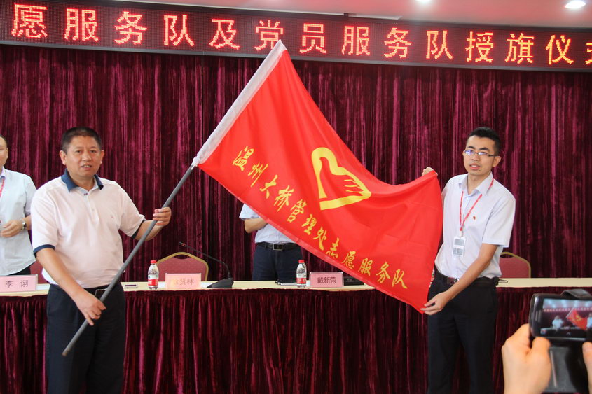 仪式首先由叶副主任宣读《关于成立温州大桥管理处志愿服务队的通知》和《关于成立温州大桥管理处党员服务队的通知》,并由徐书记为党员服务队及志愿服务队代表授旗。随后,戴主任对处志愿服务队及党员服务队成立的背景、目的以及筹备过程做了介绍,并希望全体志愿者以此次授旗仪式为契机,认真贯彻落实集团党建特色品牌工作部署,充分发挥党员干部和团员青年先锋模范作用,带领全体志愿者深入开展各项志愿服务工作,为打造温州大桥志愿服务品牌作出应有贡献。