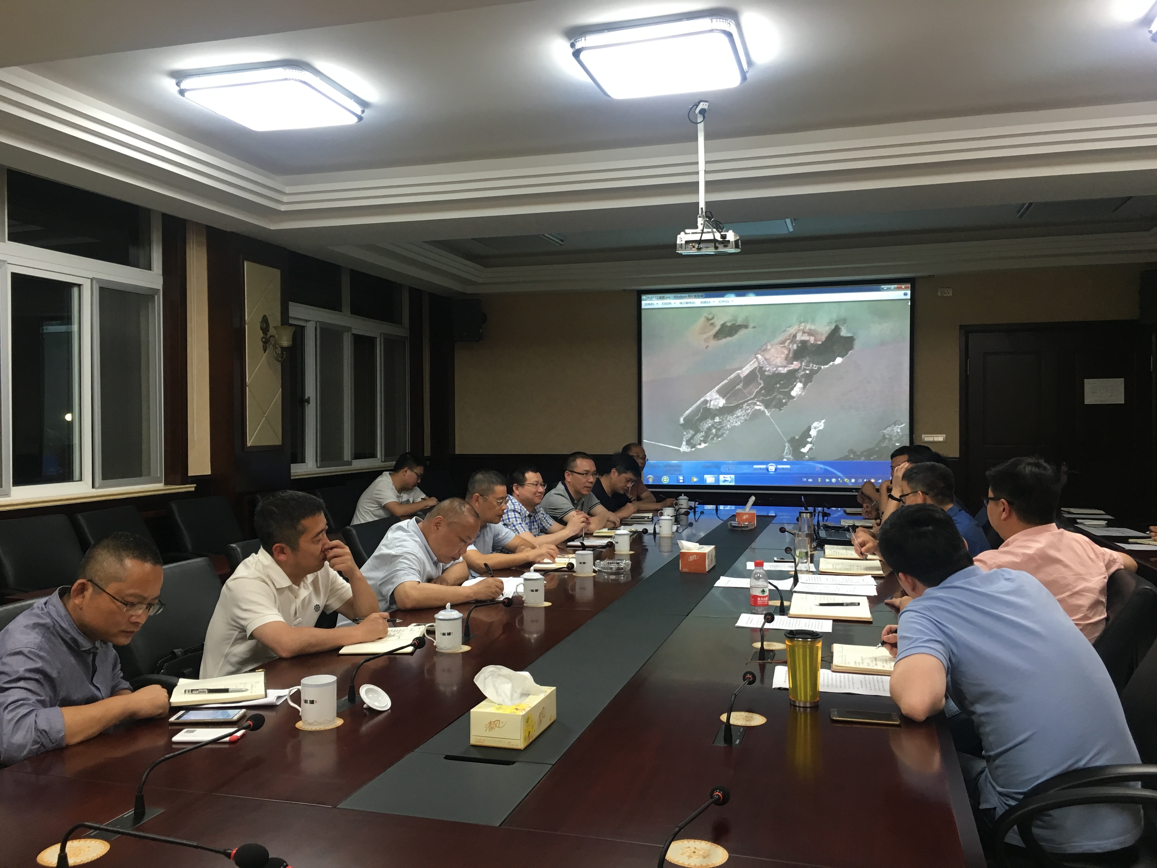 5月18日,夜幕下的大门岛,远离城市的喧嚣,宁静而美丽,大小门岛公司内一片灯火通明,这是驻夜值守的工作常态。同时也是在这一天,洞头区常务副区长叶海峰带领区发改局、交通局和大门镇政府有关负责人再度夜访大小门岛公司。