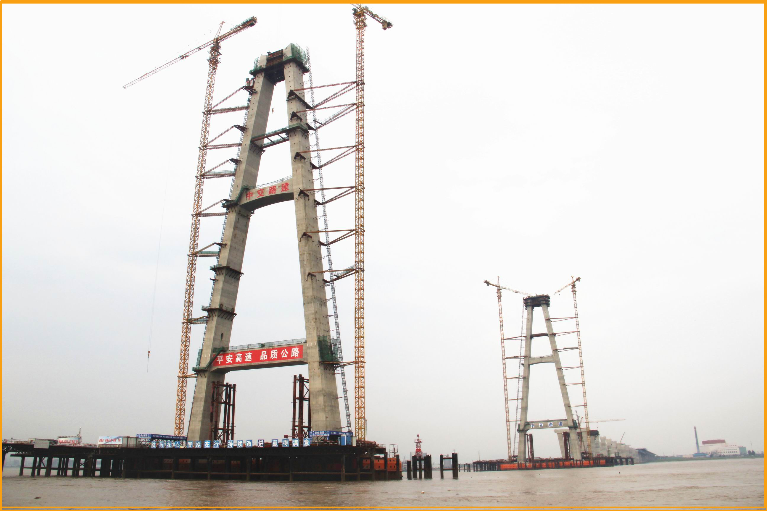 飞云江跨海特大桥为双塔双索面钢混叠合梁斜拉桥,桥梁主跨