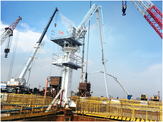 瓯江北口大桥中塔钢沉井进行井壁混凝土灌注