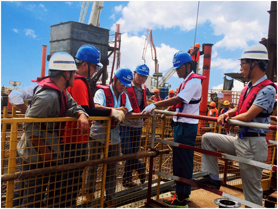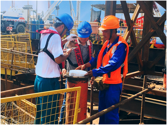 据瓯江北口大桥中塔钢沉井技术总工于宏伟介绍,此次井壁混凝土灌注施工采用垂直导管拔球法,分舱、分次、对称浇筑水下井壁及隔墙混凝土(第一批次浇筑井壁混凝土17.5m,隔墙混凝土17m,共计21854.2方)。在保证沉井井壁混凝土拌合质量的前提下,单位时间内的混凝土供应量、连续性是施工成败关键。为此,施工过程中设置了三项关卡,由施工单位对混凝土拌合时间进行论证、监理工程师见证、试验监理工程师现场取样验证,各项指标均显示为合格。