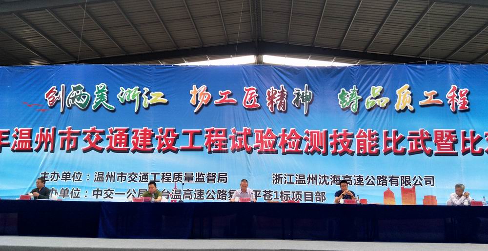 9月29日,2017年温州市交通建设工程试验检测技能比武暨比对活动在甬台温复线瑞安至苍南段工程1标预制场举行。市交通运输局副局长沈伟卿、市交通建设工程质量监督局局长周建华、省交通建设工程质量监督局副处长陈妙初、沈海公司总经理蔡邦国等出席活动。来自市辖区内的交通建设工程检测机构、现场检测单位及工地试验室等多家单位共选派230名检测工程师参赛。