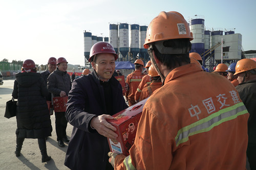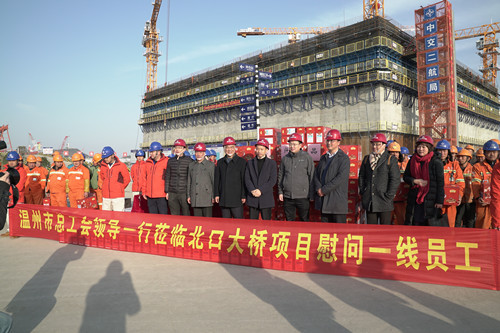 程龙凤一行来到瓯江北口大桥项目土建三标现场,对奋战在工地一线的工人进行慰问,每到一处与工人们一一握手,并为他们送上了冬日的温暖和新年的问候,本次慰问也是温州市总工会开年以来送慰问工作的第一站。