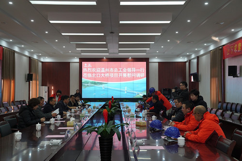 1月11日,市总工会党组书记、常务副主席程龙凤、副主席张红军一行来到温州瓯江北口大桥项目现场进行慰问调研,并现场指导工地联合工会及立功竞赛筹备布置工作。集团董事长秦肖,副总经理周列茅,工会主席王道川及瓯江口大桥公司郑锋利等人员陪同。