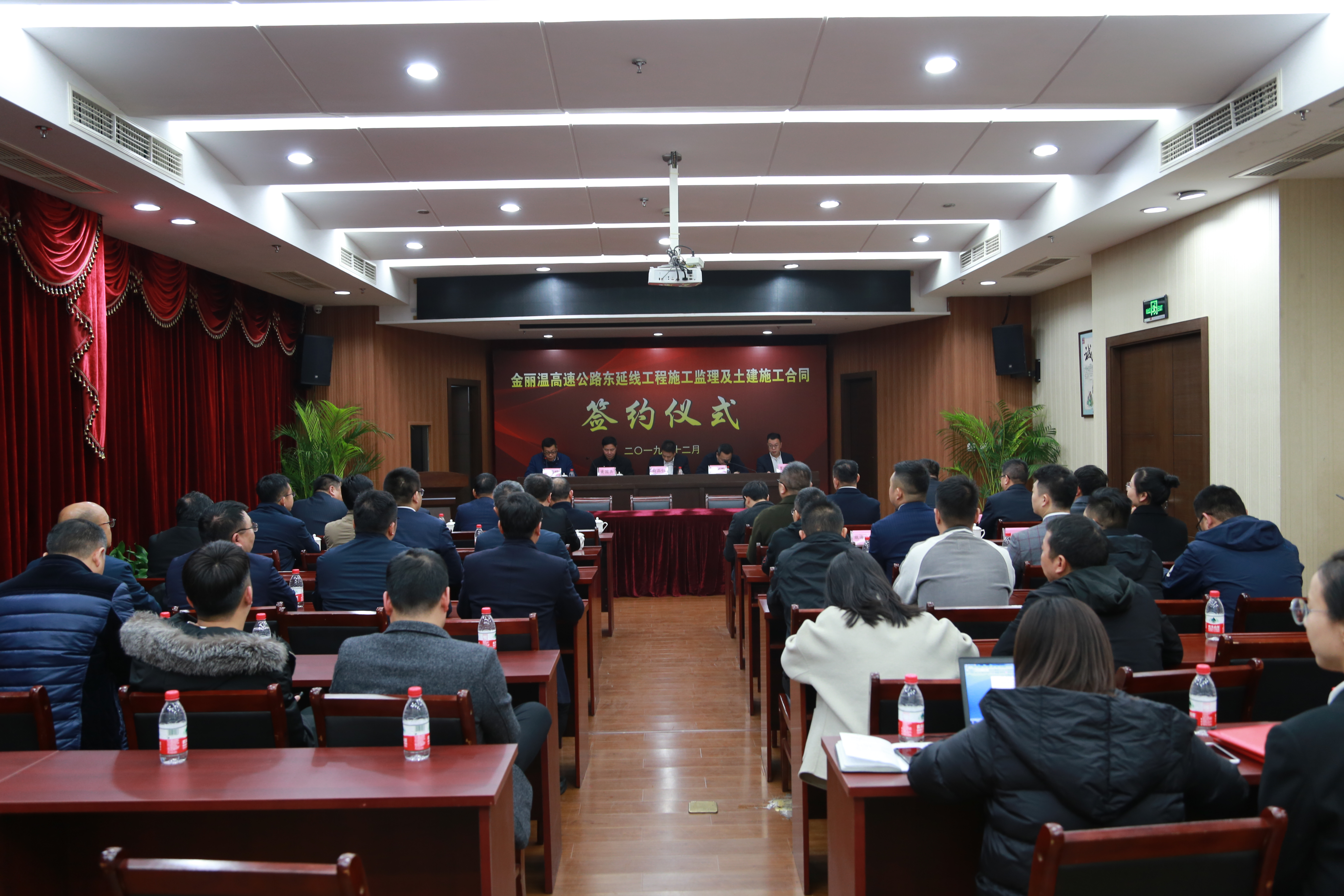 12月20日,金丽温高速公路东延线工程举行施工监理及土建施工合同签约仪式。市交投集团总经理南品仁、副总经理周列茅,市交通运输局建设处处长黄国岳及项目负责人出席签约仪式。