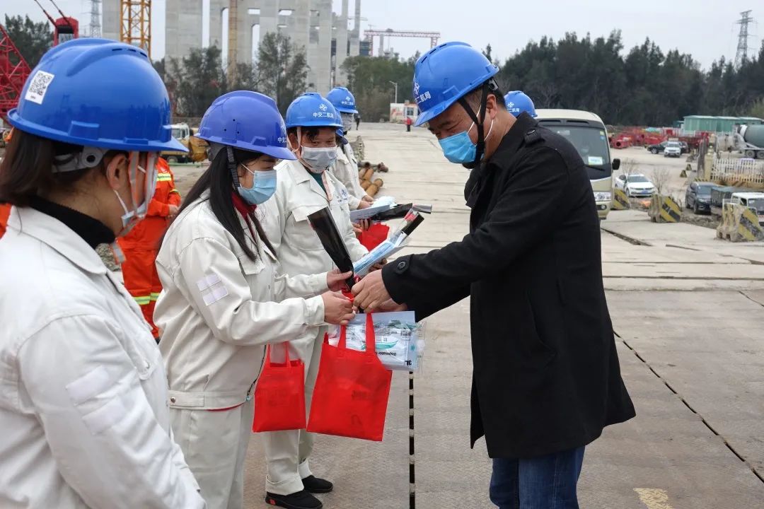 当天上午,南品仁一行来到瓯江北口大桥项目现场,为驻守在项目一线的女职工送上日用品、玫瑰花、防疫口罩及疫情防控知识手册,感谢她们的辛勤工作。