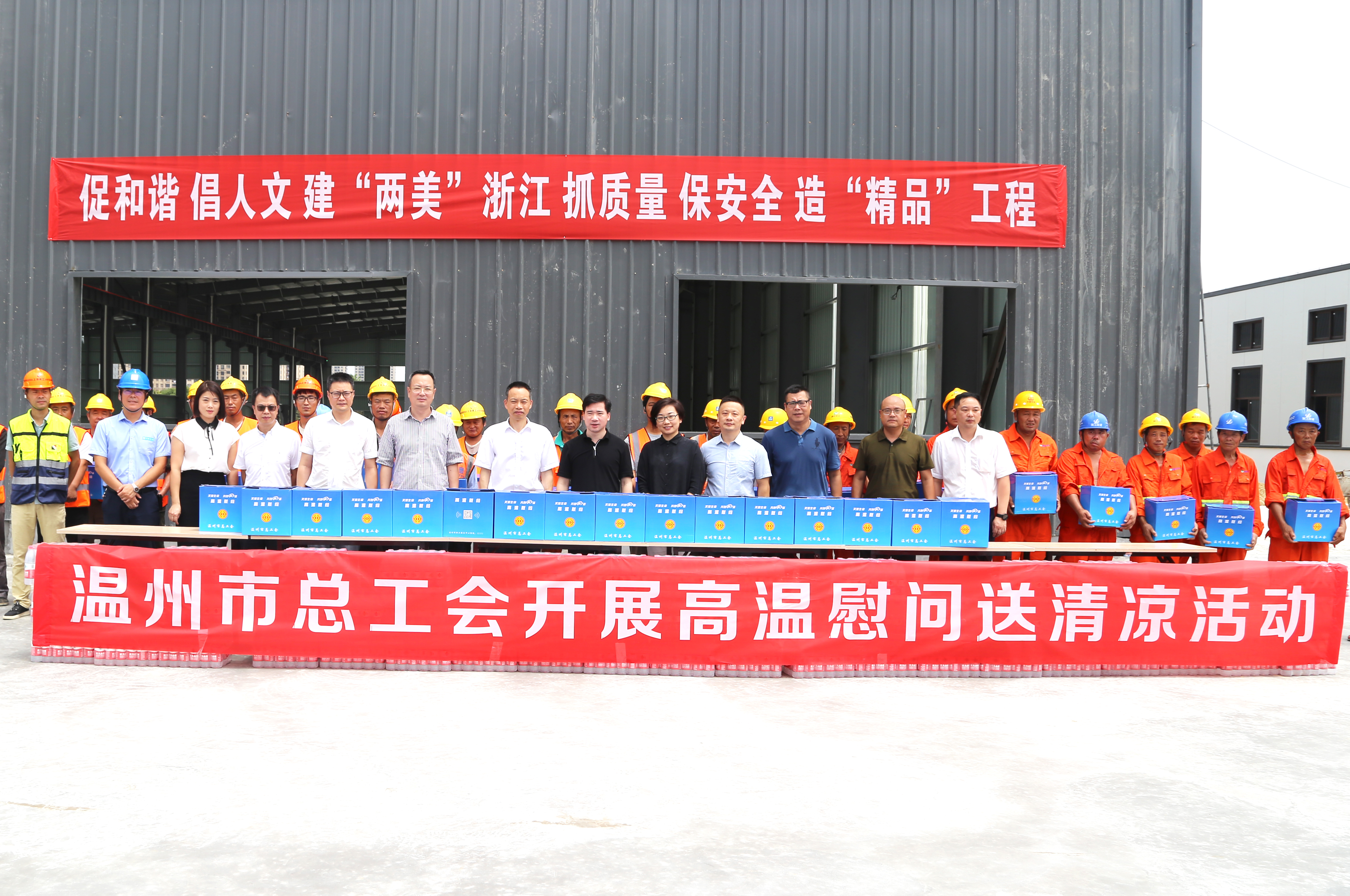 8月11日,温州市总工会党组书记、常务副主席程龙凤、副主席刘赛一行赴金丽温高速公路东延线工程开展高温慰问送清凉活动,best365足球官网党委书记、董事长朱三平、党委副书记周列茅陪同慰问。