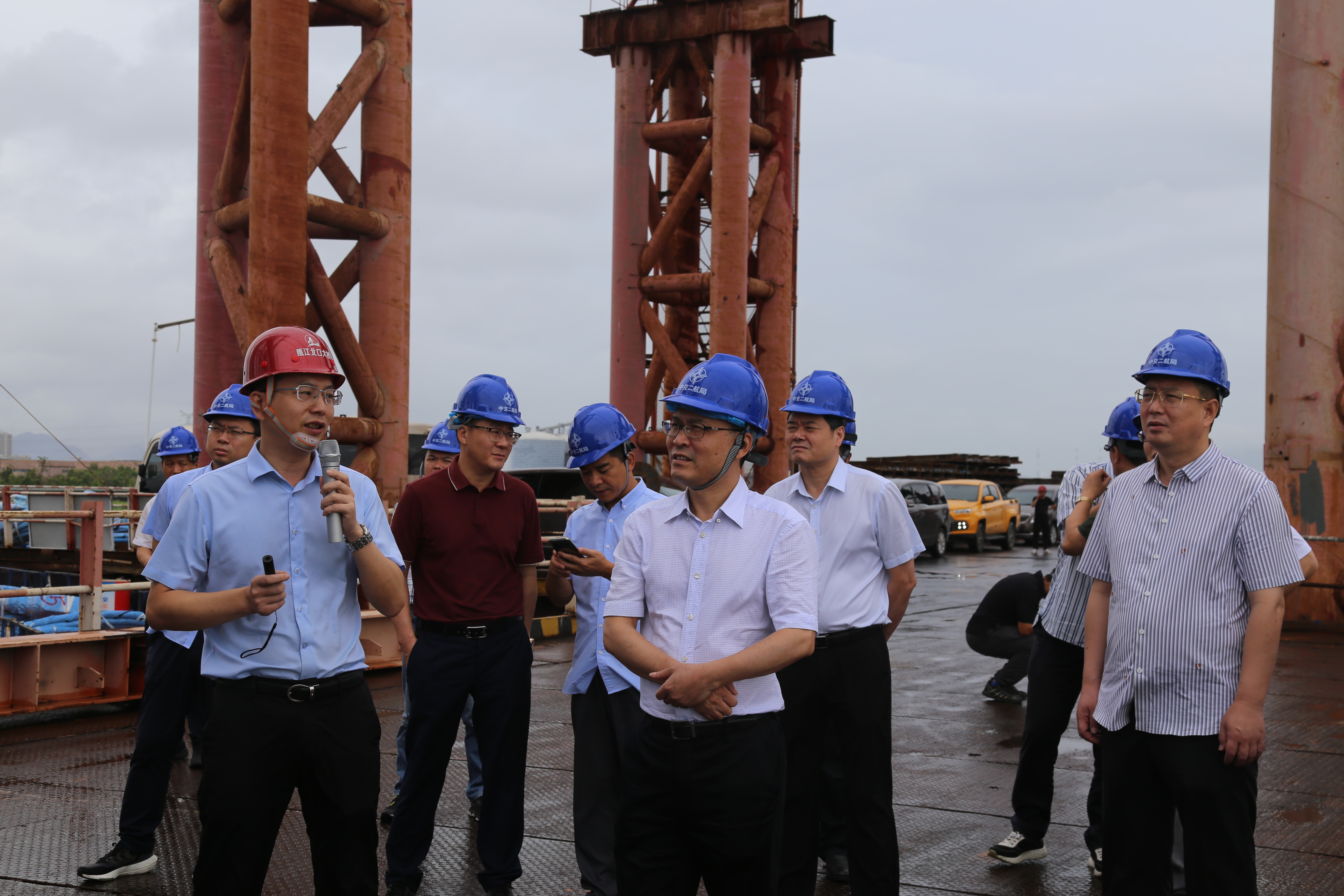 一行人在北口大桥南塔施工现场实地考察了项目的建设情况,听取关于项目工程建设概况、建设进度、技术创新及上部结构施工情况的详细汇报。
