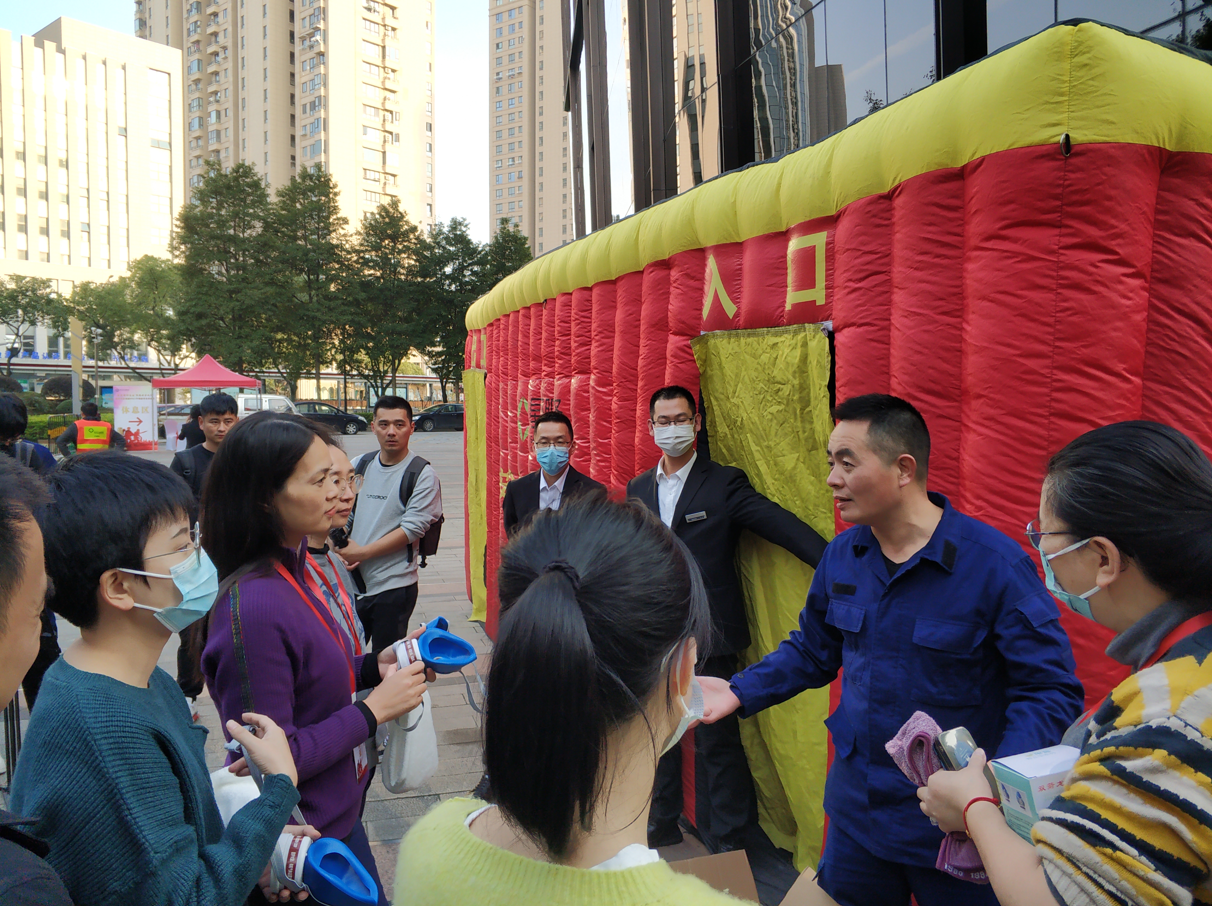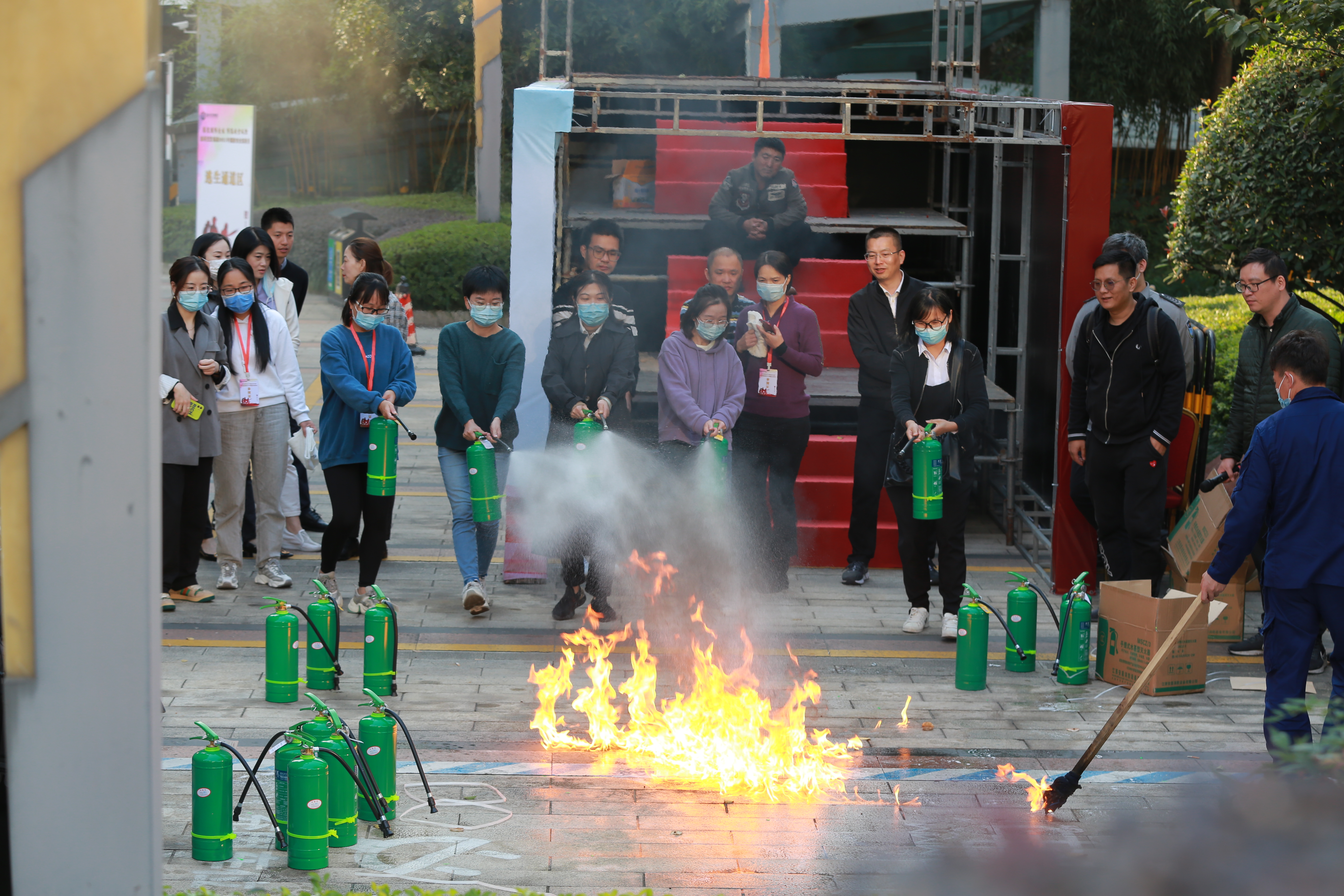 在郭溪消防队工作人员带领下,全体人员逐一参加模拟训练逃生通道、高空逃生绳讲解及使用、灭火器的讲解及使用等三项活动。