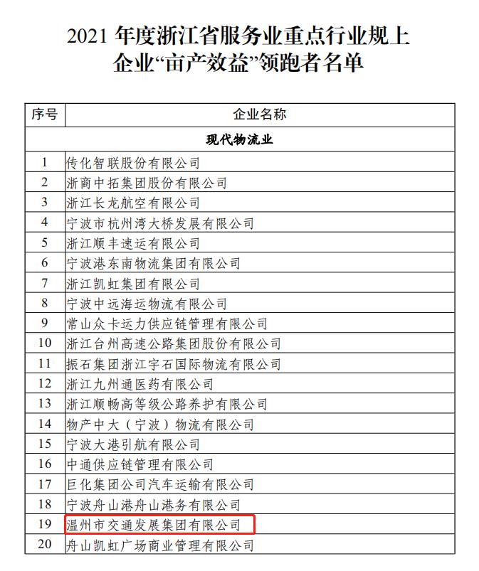 近日,浙江省现代服务业发展工作领导小组办公室公布2021年度浙江省服务业重点行业规上企业“亩产效益”领跑者名单,best365足球官网榜上有名,为温州市现代物流行业唯一一家获此殊荣的企业。