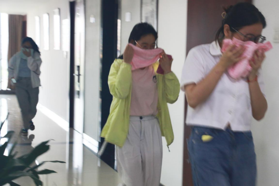 下午3时30分,随着大楼火警响起,楼内全体人员闻声而动。大家按照火场疏散演练要求,用湿毛巾捂住口鼻,俯首低行,沿着最近的安全疏散路线。楼内人员仅用时不到5分钟,便全部安全、有序地疏散至户外安全区域。全体参演人员还参与了使用灭火器扑灭一般火灾的操作和练习。
