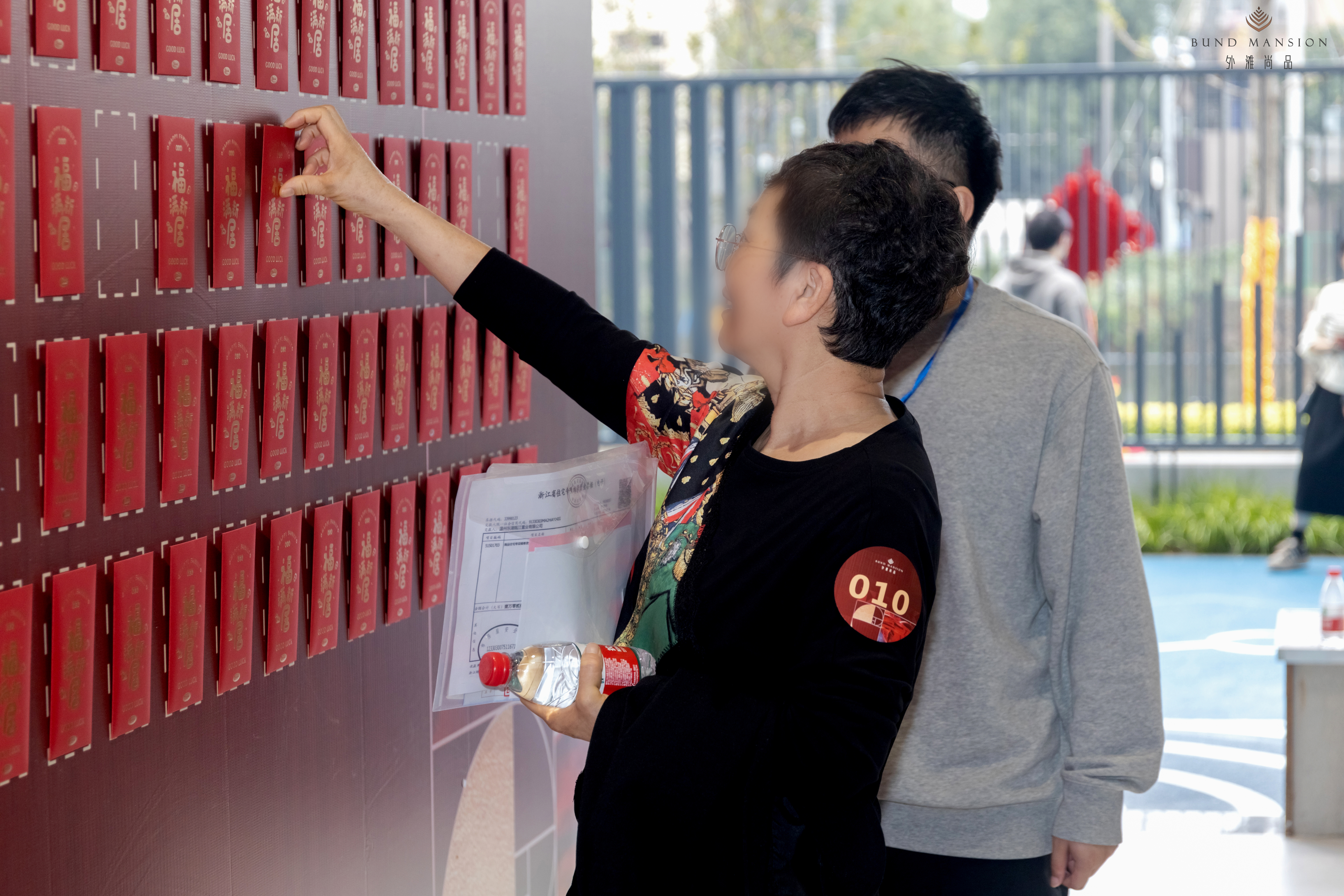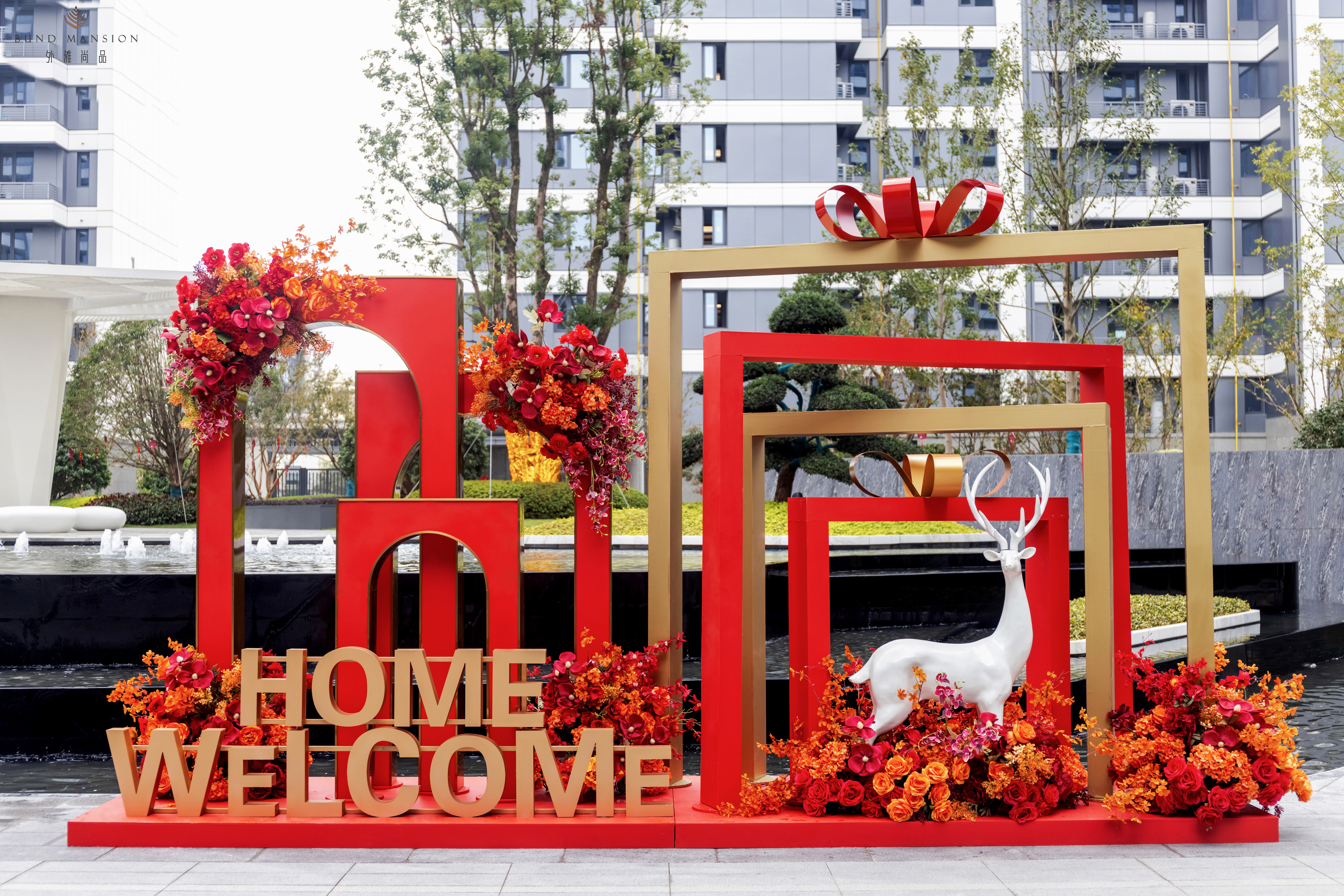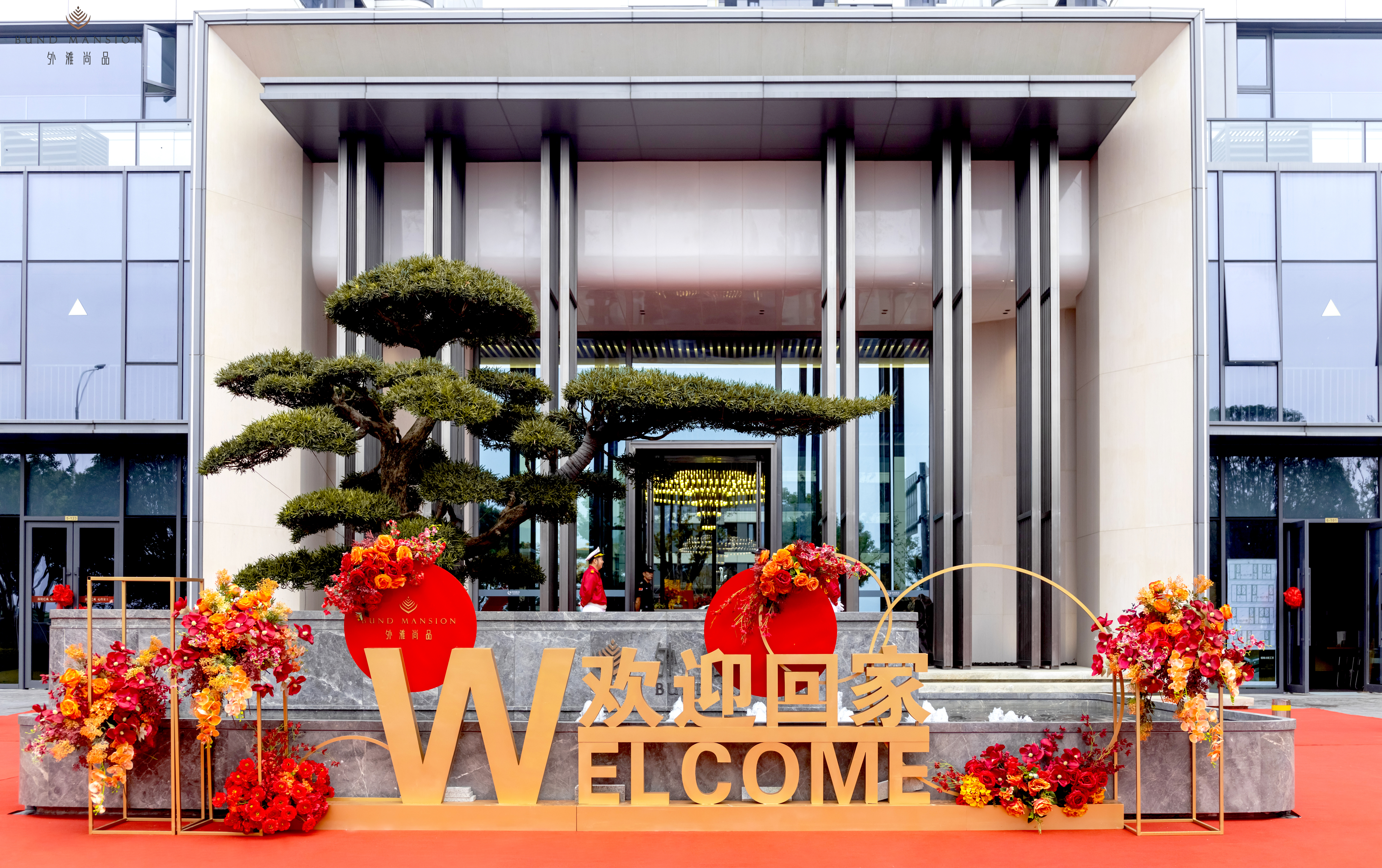 交房现场欢庆喜悦,阳台布置的红色花球,围栏布置的红色中国结,树木布置的红色灯笼,入口布置的红色地毯,用心妆点归家路上的幸福与温馨。一目了然的导视指引,合理规划的流程动线,“欢迎回家”的真诚祝福,进一步增添交付的氛围感和仪式感。