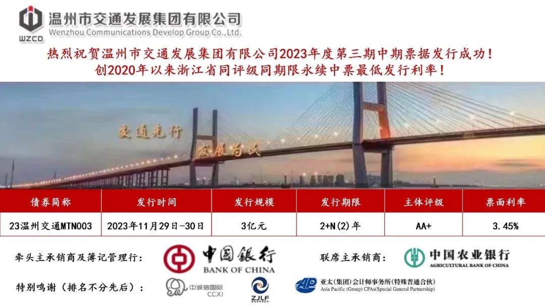 区别于普通中期票据,本次募集资金将计入所有者权益,从而降低集团资产负债率,扩充集团净资产规模,为后续融资打开了空间。下一步,集团将持续用好用活各债券融资工具,持续拓展多元化融资渠道,全力推进融资降本提质,助力温州加快打造全国性综合交通枢纽城市。