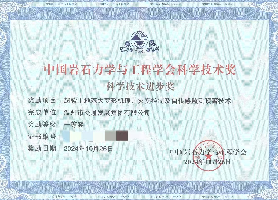 近日,温州市交通发展集团有限公司参与完成的科研项目“超软土地基大变形机理、灾变控制及自传感监测预警技术”从94项申报研究课题中脱颖而出,荣获2024年第十五届中国岩石力学与工程学会科学技术进步奖一等奖。