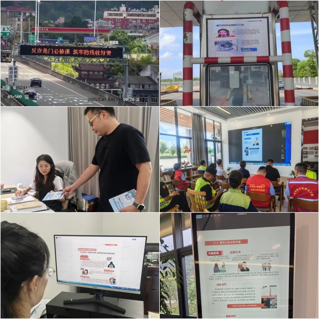 线上,向全体员工推送反诈知识、典型案例,组织观看反诈视频,通过直观案例引导全员树立警觉性,时刻绷紧反诈之弦。线下,在公共空间显示屏高频次滚动播放反诈宣传视频,依托高速沿线可变情报板、收费站LED屏,持续展示“反诈是门必修课”等警示标语;同时印制发放宣传手册,供员工和司乘随时学习;服务区设置专栏张贴反诈海报横幅,日均覆盖超1000人次。